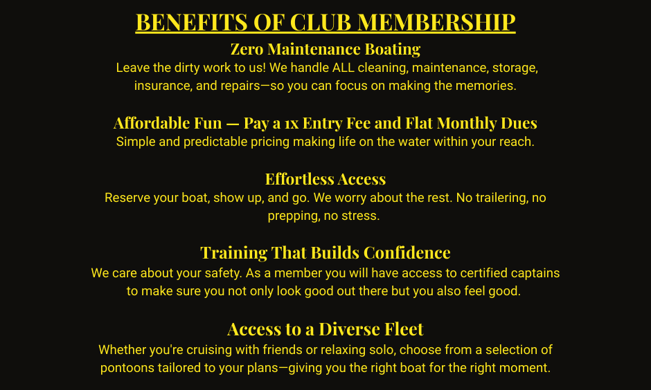 - Member has access to all main fleet boats Monday through Friday during our hours of operation.